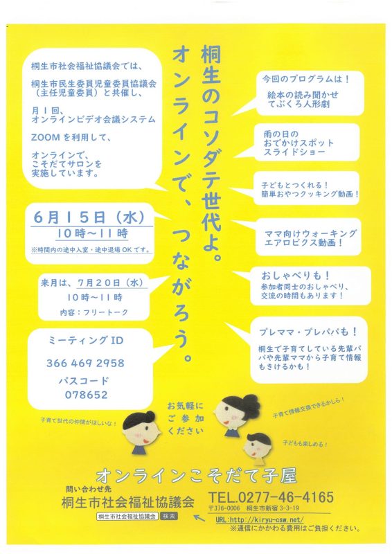 桐生市社会福祉協議会では、桐生市民生委員児童委員協議会(主任児童委員)と共催して、月1回のペースZoomを利用したこそだてサロン「オンラインこそだて子屋」を実施しています。子どもが楽しめるのはもちろんのこと、子育で世代の仲間がほしい、情報交換したい方などにもお勧めのイベントです。