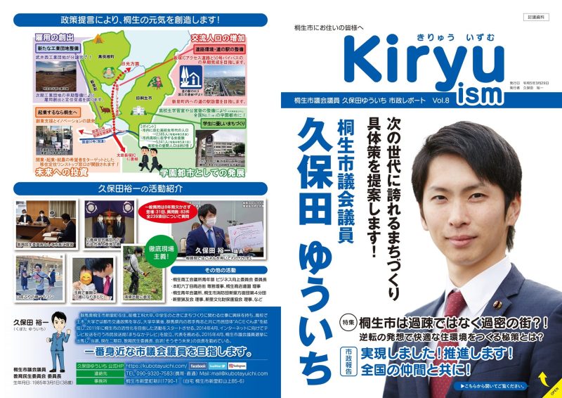 3月29日(水)の朝刊各紙に久保田ゆういち 市政レポート「Kiryu ism(きりゅういずむ)」を折り込ませていただきました。今回は旧桐生市内、黒保根町内への配布となり、新里向けのレポートは別途町内にて配布させていただいています。