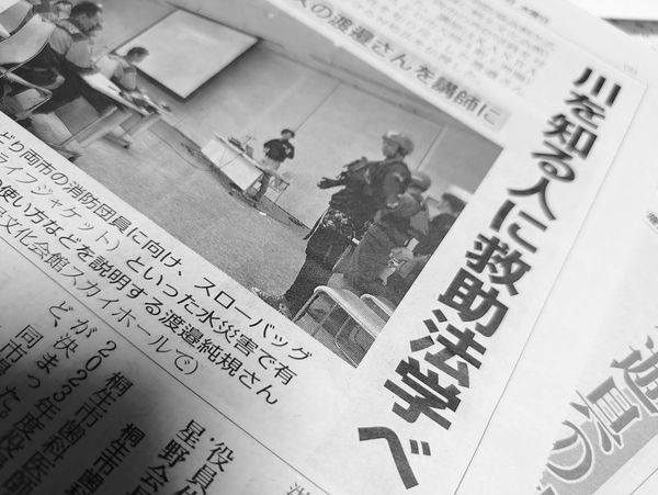 今回の講師は、急流救助の国際資格であるRESCUE3のうち「スイフトウォーターレスキュー」と「テクニカルロープレスキュー」の2つの資格を発行できる日本でたった8名しかいない講師の一人であり、みどり市在住の渡邉純規さんです。今回の講座では「急流の現場」という非常に危険性の高い状況の中で、いかに効率的かつ安全に救助活動を行うことができるか、またそのために必要な「正しい考え方」や 「実績のある方法」「安全な装備」などを、実演も交えながら実施していただきました。