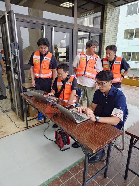避難場所となったみどり市内の中学校では体育館泊や車中泊、校庭でのキャンプ泊の3タイプの宿泊方法を用意。到着した避難者はQRコードを読み込んでデジタルチェックインを行い、桐生市・みどり市の職員の皆様がパソコンで避難状況を確認しました。デジタルチェックインの訓練も桐生みどり地域初の試みです。