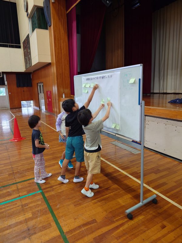 翌朝は振り返りのワークショップを実施。避難所生活で何が不便だったか、何を用意すれば良かったのかを考えてた後は群馬大学 大学院 理工学府の金井教授より講評をいただき、短いけど密度の濃い避難生活は幕を閉じました。一晩協力して生き抜いた子ども達の姿は少し頼もしくなったように感じます。