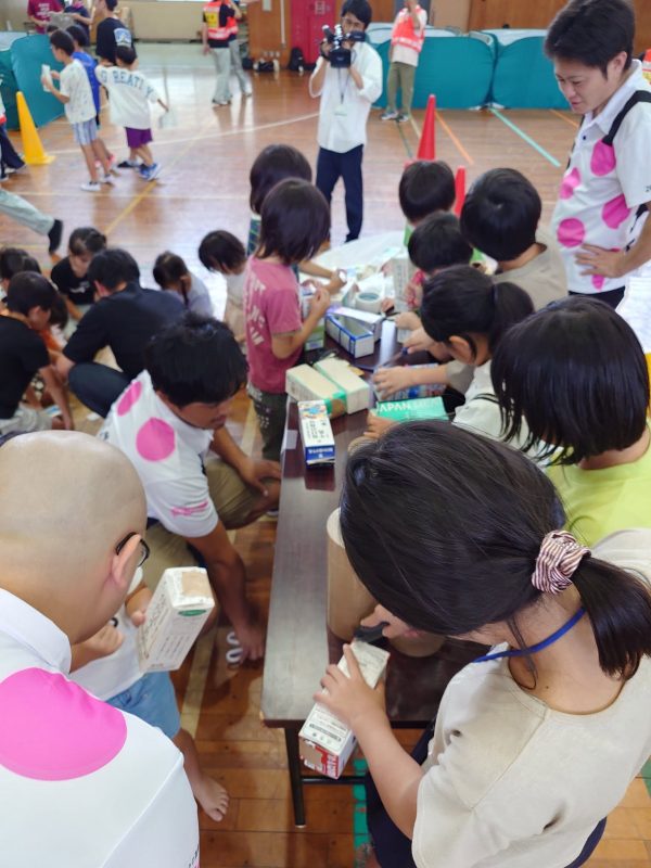 避難所では桐生市・みどり市の社会福祉協議会による災害ボランティアセンターが立ち上がり、ボランティア登録をした小学生が段ボールパーテーション作りや、パッククッキング、牛乳パックのお皿作りなどボランティア作業に従事。避難所で決してお客様にならず、みんなで協力して運営していく姿勢を学びました。なお、9月11日(木)に桐生市・みどり市の社会福祉協議会と桐生青年会議所の三者は災害ボランティアセンターの運営協力に関する協定を締結しており、今回は協定に基づく初の立ち上げ訓練にも位置付けています。