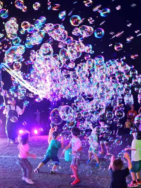 日が暮れたらしゃぼん玉おじさんによるパフォーマンスで子ども達は大盛り上がり。これこそ、ここでしか体験できない最高に贅沢な時間ですね。